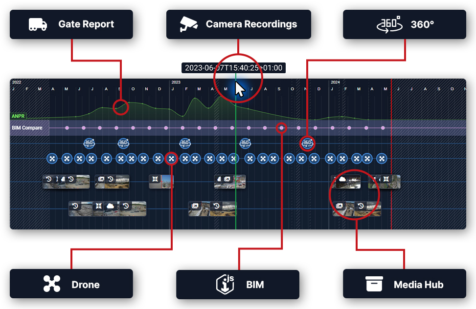 Another major highlight is Evercam Timeline. This feature combines all your project data in one easy-to-access view, combining feeds from cameras, drones, 360� captures, and more. No more switching between multiple tabs - with the Timeline, you�ve got full visibility of project progress, logistics, and safety in one place.