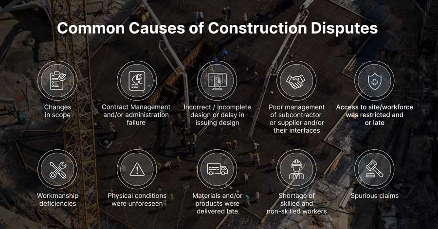 In fact, some of the main causes of construction disputes includes workmanship deficiencies, unforeseen physical circumstances that cause delays, poor project management and delay in issuing designs among many others as highlighted in the figure below.